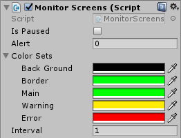 Updating the effect at runtimeYou can change the Alert value at run time by using thego.SendMessage(MonitorDefines.UpdateAlertMessage, newAlert);You can pause and un-pause the effect withgo.SendMessage(MonitorDefines.SetPauseMessage, true);Andgo.SendMessage(MonitorDefines.SetPauseMessage, false);You can find UpdateAlerts.cs as an example of the above code.