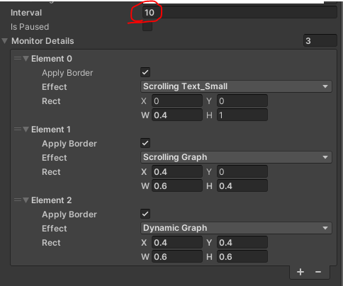 After inporting the package in to your unity Project.Added the prefab of the resolution you wish to use (32,64,128,256) Resize and roation the panel to set where it appearsRunning the game will show the basic default DMUNow to update the displayNow add two more elements to this section.Set the interval as 10Then set all 3 elements as shown hereAnd in game you can see the 3 panels.